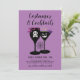 Os convites para na moda definem o tom para uma fantasia de Halloween adulta e festa de cocktail! O convite apresenta vinho negro e óculos martini com ossos brancos crânio-e-cruzados e designs de estêncil jack o'lantern, cheios de misturas tóxicas, e acentuados com detalhes assustadores de cobra, aranha e teia aranha. A cor de fundo roxa pode ser personalizada. A parte traseira da placa apresenta um padrão moderno de faixas diagonais preto e branco.
