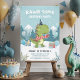 Celebre o grande dia do seu pequeno com este adorável convite de aniversário de dinossauro de inverno RAWR-some! Com um adorável T-Rex verde com chapéu e cachecol de festa, cercado por montanhas nevadas, pinheiros, balões e presentes, este convite é perfeito para uma festa de aniversário de inverno aconchegante. Fácil de personalizar com o nome da criança, idade, detalhes da festa e informações de RSVP.