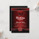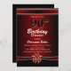 Convite de festas de janto de aniversário de 90 vermelho e preto com texto branco e fita e arco vermelho e branco. Substitua os detalhes deste convite por você para criar o convite de aniversário perfeito para o seu evento.