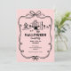 Hospede uma soirada assustadora com este Convite de festas Jante de Halloween! Apresentando ilustrações bonitinhas no estilo de vintage de um bolo, velas, crânio e jack-o-lanterna a tinta preta sobre um fundo de grelha cor-de-rosa pastel com arcos e uma estrutura gótica. Perfeito para elegantes encontros de Halloween ou festas de janto assombradas. Texto totalmente personalizável.