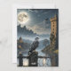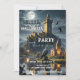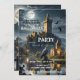 Convite de festas jante de Halloween com um castelo na lua de cheio, com morcegos, falcão e crânio. Um convite único e artístico para uma celebração em estilo.