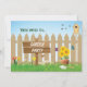 Um dia ensolarado é o cenário perfeito para um almoço no jardim. Peça aos convidados que tragam os polegares mais verdes e troquem sementes e pontas de jardinagem. Ou apenas aproveite a vista e faça uma festa de chá ou cocktails ao entardecer. Uma cerca de quintal é mostrada com um sinal de madeira indicando o nome do evento. Está rodeado de tulipas, narcisos e girassóis prontos para plantar. Borboletas e pássaros são pegos voando ao redor do local com uma casa de pássaros em pé atrás da cerca. O inverso mostra as ferramentas do comércio, incluindo uma pá e luvas de jardinagem ao lado de uma mesa que está sendo armada para uma diversão. Adicione texto personalizado entre o fim da cerca e a mesa. Disponível com produtos correspondentes.