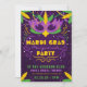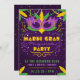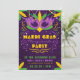 Mascarada Mardi Gras Convite de festas em roxo e ouro com máscara.