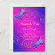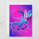 Belo convite de festas roxo e rosa-quente com bonito azul-lacre, rosa-quente roxo e máscara de pena azul-real em um lindo fundo azul-real e rosa-quente. Este elegante convite de festas roxo e azul-real e roxo é facilmente personalizado para o seu evento simplesmente adicionando detalhes do seu evento, estilo de fonte, tamanho de fonte e cor e texto. Esta é uma design impressa sem brilho real, penas, joias, etc.