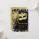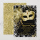 Convite de festa de máscaras preto e dourado com máscara de pena de jóia dourada elegante em um belo fundo de bokeh com desenho de glitter dourado no verso. Este convite de festa de máscaras preto e dourado é facilmente personalizado para o seu evento, basta adicionar seus detalhes no estilo de letra, cor e texto de sua escolha.