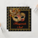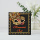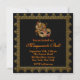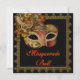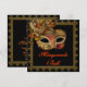 Convite para festa de máscaras de Halloween com fantasia preta e laranja e máscara veneziana preta e laranja.