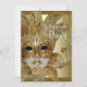 Convite de festa de máscaras preto e dourado elegante com bela máscara dourada em um fundo dourado elegante. Este convite de festa de máscaras preto e dourado é facilmente personalizado para o seu evento, basta adicionar os detalhes do evento, estilo de letra, tamanho e cor da letra e texto. Este é um design impresso sem ouro real, folha, renda, brilho, etc.