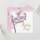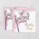 Convites de festa de máscaras rosa e dourado. Você pode excluir o texto dourado na frente e adicionar seu próprio texto para o seu evento. Adicione seus detalhes na frente e no verso simplesmente adicionando os detalhes do seu evento, estilo de fonte, tamanho e cor da fonte e texto. Por favor, note que todos os desenhos de convites que você encontrará na Zazzle são gráficos impressos em papel liso sem joias, laços, relevos, dourados ou peças ou partes adicionadas.