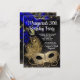 Convite de festa de máscaras azul royal e dourado com bela máscara de jóia dourada e penas em um fundo floral azul e dourado. Você pode personalizar o número conforme necessário para o seu evento - este é um convite de aniversário para qualquer número. Este convite de festa de máscaras azul royal é facilmente personalizado para o seu evento, basta adicionar os detalhes do seu evento.
