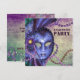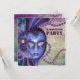 Convite de festa de máscaras com máscara roxa e contas de Mardi Gras nas cores azul real, rosa e verde. Peças coordenadas disponíveis mediante solicitação por e-mail.