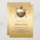 Um convite para uma festa de Natal. Um fundo com aspecto de ouro. Decorado com um grande ouro de vintage, com aspecto bálsico e estrelas ouros. Personalize e adicione os detalhes. Texto preto.