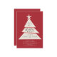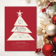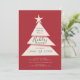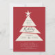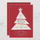 Convite moderno e simples para festas minimalistas apresentando uma árvore com o topo da árvore estrelada sobre um fundo vermelho festivo.