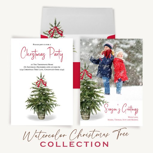 Este design apresenta uma festa de Natal, uma elegante aquarela, uma árvore de Natal festiva, um clássico tradicional, um bonito design de aquarela, vermelho e verde, com um simples minimalista, design de safra perfeito para corporações empresariais ou pequenas reuniões de férias de feliz.