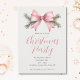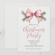 Este convite de festa de Natal encantador e personalizável apresenta um fundo verde pálido suave adornado com um delicado laço rosa e raminhos de sempre-verde. Este convite elegante captura perfeitamente a calidez e a alegria da temporada e pode ser facilmente personalizado com os detalhes da sua festa.
