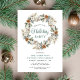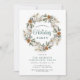 Convite para festas de Natal corporativas elegantes, com uma coroa aquática composta por flores brancas de inverno, pinecones e folhas de pinheiro verde sazonal e verde, "Festa de Férias" em um roteiro na moda verde e tipografia serif clássica e seu nome comercial e detalhes de eventos em uma simples tipografia moderna.