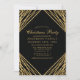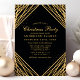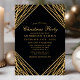 Convite de festas de Natal Geométrico e Dourado. Este elegante e moderno design abstrato da tendência apresenta linhas brilhantes de ouro com confete sobre um fundo negro sólido.