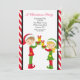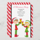 Este é um convite de festas de Natal adorável. Tem um fundo listrado vermelho e branco. Então há uma borda fina preta com um centro branco. Há uma garota bonita segurando um presente. Ao lado dela está esta linda decoração de elfos segurando presentes na mão. Os duendes estão vestidos de chapéus de Papai Noel vermelhos e verdes vestindo. Personalize com as informações da parte acima deles. Veja os muitos outros designs e produtos que temos nos convites de Natal. © Ilustrações JW