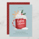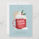 Xícara de cacau quente com creme chicoteado, salsichas e ilustração de biscoito com floco de neve com texto editável, incluindo título para qualquer festa de natal. Ilustração original de Becky Nimoy