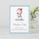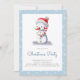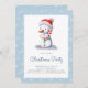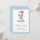 Convite de Natal azul minimalista com uma ilustração de um boneco de neve segurando uma cana doce. Personalize o texto com suas próprias informações. Ilustrada e projetada por Patricia Alvarez.