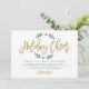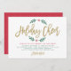 O convite para festas festivas do design apresenta um texto antigo de "Holiday Cheer" de ouro moderno com acentos de folhagem de verde e de fermento vermelho. Personalize o texto personalizado com o texto preferido. A parte traseira da placa inclui um fundo vermelho com padrão de bolinhas branco.