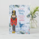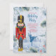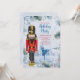 Um convite para festas de Natal de Balé Nutcracker. Há um soldado de brinquedo preguiçoso no primeiro plano e uma cena natural de inverno nevado no fundo com uma silhueta de uma dançarina balé dançando.