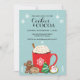 Calma com uma caneca de cacau quente e biscoitos numa festa de férias divertida. Um fundo azul manchado de neve mostra a caneca vermelha tocada com uma canela de canela e chantilly. Os biscoitos de Natal estão prontos. Use para uma festa de Natal ou cacau, uma festa de aniversário com tema de chocolate quente, uma festa com bar de cacau, ou até mesmo uma festa de patinação de gelo poste! Disponível com produtos correspondentes.