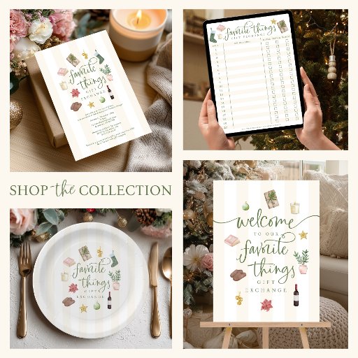 Hospedar uma festa memorável com nossos convites de Natal personalizáveis de troca de presentes 'Coisas Favoritas'. Esta elegante e moderna design apresenta uma paleta de aquarela suave e neutra e ilustrações encantadoras de presentes populares como uma vela confortável, uma planta doméstica, uma garrafa de vinho, juntamente com algumas ilustrações de Natal. Personalize facilmente todos os detalhes da celebração de feriado, incluindo a data, hora, local, informações de RSVP e instruções para a troca de presentes. É a maneira perfeita de convidar amigos e família para uma troca de presentes festiva onde todos descobrem coisas novas favoritas! © Kimbellish, LLC