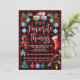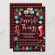 Convide seus amigos e família para uma festa de troca de presentes de Natal "Coisas Favoritas" com este convite de xadrez vermelha com ilustrações de baubles, luzes, estrelas, meias, presentes, doces e ramos festivos. Modelo totalmente editável com os detalhes do evento, nomes de hospedagem e informações de rsvp.