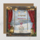 Uma cena de inverno como se vê olhando pela janela da vintagem com um convite para uma festa de Natal da família Aproveite o silêncio deste convite com nevando fora, cortinas vermelhas e lanternas iluminadas com luzes suavemente brilhantes