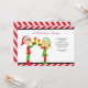 Este é um convite de festas de Natal adorável. Tem um fundo listrado vermelho e branco. Então há uma borda fina preta com um centro branco. Tem uma garota linda segurando presentes. Ao lado dela está um rapaz bonitinho fazendo a mesma coisa. Os duendes estão vestidos de chapéus de Papai Noel vermelhos e verdes vestindo. Personalizar com informações de partido ao lado deles. Veja os muitos outros designs e produtos que temos nos convites de Natal. © Ilustrações JW