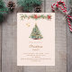 Um convite de inverno para uma festa de Natal. Um fundo creme macio, bege, na frente, decorado com um pinheiro desenhado à mão, de cor aquosa, com ornamentos vermelhos e ouros. Algumas estrelas e uma terra decorada no Natal com cones e flores vermelhas de Poinsettia. Personalize e adicione os detalhes da sua festa. Texto do ouro.