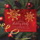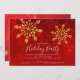 Festa moderna de elegância com fundo vermelho com flocos de neve dourados.
