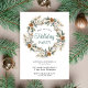 Convite elegante para festas de Natal com uma coroa aquática composta por flores brancas de inverno, pinecones e folhas de pinheiro verde sazonal e verde, "Festa de Natal" em um roteiro verde na moda e tipografia serif clássica e detalhes de seus eventos em simples tipografia moderna.