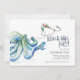 Os convites bonitos de Natal de praia apresentam um polvo azul-aquarela com uma corda de luzes de Natal. As palavras "Festa de Beachmas" são colocadas em letras divertidas. Uma escolha encantadora para uma festa de feriado costeira ou de barco. Arte e design de aquarela únicas de Victoria Grigaliunas de Do Tell A Belle. Para ver mais modelos de convites para festas de férias visite www.zazzle.com/dotellabelle