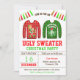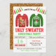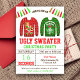 Convide seus convidados com este convite de festas de suéter engraçado e feio que apresenta tipografia moderna e suéteres de Natal engraçados contra um fundo branco. Basta adicionar os detalhes do seu evento neste modelo fácil de usar para torná-lo um convite de tipo único. Sacudir a placa para revelar uma textura falsa de brilho dourado na parte traseira da placa.