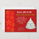 Um convite para festa de natal festivo. Um fundo vermelho com flocos de neve dourados ao longo do lado esquerdo. Uma árvore de natal verde na frente e uma ilustração festiva decorada de árvore de natal branca nas costas. Personalize com os detalhes do seu próprio partido.