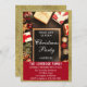 Convite de festas de Natal festivo, com brilho de ouro cintilante, brilha a borda e os presentes vermelhos com arcos em torno de um quadro negro sobre madeira marrom rústica. Os detalhes da festa são escritos em branco com um fundo vermelho brilhante. Este é um feriado perfeito/ Natal/ convite de inverno!