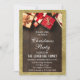 Convite de festas de Natal festivo, com uma borda brilhante de ouro, brilha, presentes vermelhos com arcos e elegante escrevendo branco sobre madeira castanho-escura rústica. Este é um feriado perfeito/ Natal/ convite de inverno!
