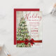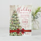 Natal / Casa Aberta / modelo de Convite de festas Jante com "Árvore de Natal com Luzes Fadas" e Fita Vermelha sobre fundo de madeira rústico. Imprima aos seus amigos este design de convite sofisticado e elegante. Totalmente personalizável!