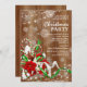 Convite para festas de natal russo, com fundo de madeira escuro, buquê de flores vermelhas poinsettia xmas, doces coloridos vermelhos e verdes, cones de abeto, folhagem branca, flocos de neve brancos delicados e fita festiva. O fundo é criado usando círculos de cobertura transparentes criando um efeito de neve do inverno e um modelo moderno que é fácil de personalizar.