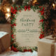 Uma design de Natal festiva, enquadrada com poinsetos vermelhos clássicos, galhos de pinheiros e verde de inverno. O estilo de vintage rústico captura o calor e a conforto da época de férias, perfeito para uma celebração tradicional de Natal.
