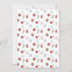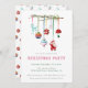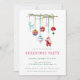 A frente do cartão apresenta um tema de feriado simples e elegante. Um galho fino adornado com vários ornamentos pendurados, incluindo uma rena, uma bola colorida do arco-íris, bolhas padronizadas, um cogumelo e uma figurina de Papais noeis, acrescenta um toque caprichoso e festivo.