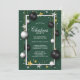 Convide seus amigos e família para a celebração de Natal deste ano com este convite moderno que mostra uma fronteira branca enfeitada com bolas de árvore de Natal preto e branco em frente a um fundo verde.