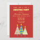 Convite de festas de Natal simples, fofo, moderno e vermelho, com pinheiros coloridos, padrões de vintage com o roteiro de tendências.