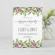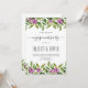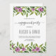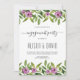 Um convite à festa de noivado de casamento floral roxo de Watercolor. A parte superior e inferior é coberta por uma terra verde com flores roxas.