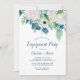 Este clássico convite para festa de noivado de flores brancas é perfeito para um evento de primavera. O elegante design floral apresenta marfim macio e rosas brancas, peonias e crisântemo com toques de flores azuis de cor azul-rosada e folhagem verde.
