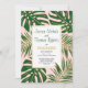 Monstera tropical e palmeira deixam um convite verde e festa de noivado de ouro. Mostra um padrão de folhas tropicais com contorno de ouro em rosa-pincel e seu texto em um quadro branco. O verso inclui um padrão de bolinhas dourada.