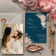 Este marinho de convite para festa de noivado de fotos de design de de cor azul escamoteado apresenta belos fundos clássicos de cor-de-rosa pastel e azul marinho com simples tipografia moderna e caligrafia elegante para definir um tom sofisticado para qualquer estilo de evento. Cada produto é embelezado com rosas rosas rosadas e escamosas, cor-de-rosa, bem como fitas de pêssego e de marfim, dispostas com eucalipto e detalhes de folha verde, bem como armações geométricas de ouro de eterno para um aspecto luxuoso. Misture e combine esta coleção coordenadora para uma estética de casamento de sonho personalizada sem esforço para uma grande variedade de estilos casuais e formais. Para designs mais coordenadores, esse design também está disponível em branco e preto. Tal como acontece com todos os nossos design, se tiverem perguntas ou pedidos especiais, por favor, perguntem.