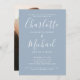 Apresentando nomes de estilo de assinatura, este elegante e moderno convite de festa de noivado simples pode ser personalizado com suas informações em letras brancas chic em um fundo azul empoeirado e fotos no verso. Projetado por Thisnotme©