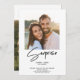 Compartilhe a surpresa do seu noivado em estilo com este convite de festa de noivado branco e preto giro, moderno, com a sua foto favorita, e um roteiro escrito à mão. A parte de trás do anúncio mostra outra foto de noivado. Facilmente personalizado. Copyright Anastasia Surridge, todos os direitos reservados.